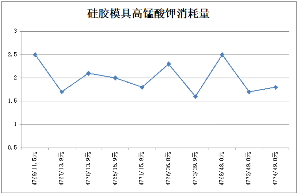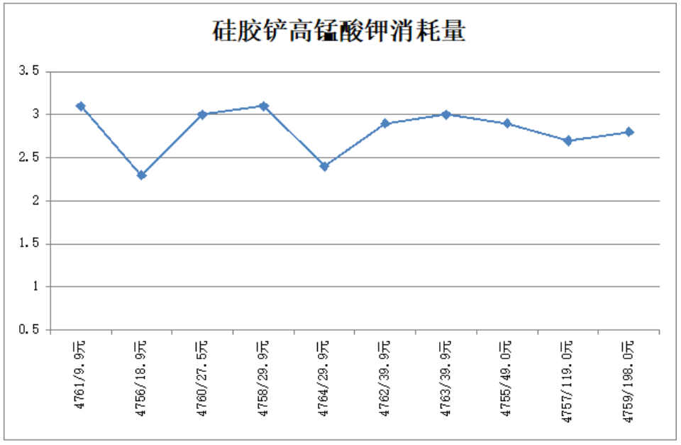 由數(shù)據(jù)分布圖可以看出,硅膠鏟、硅膠模具高錳酸鉀消耗量均符合國家標(biāo)準(zhǔn)要求,且結(jié)果值沒有隨樣品價格有趨勢性的變化。